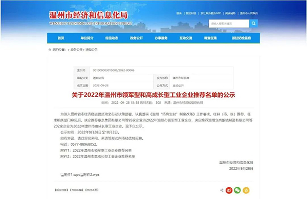 近日,溫州市經(jīng)濟和信息化局發(fā)布了《2022年溫州市領(lǐng)軍型和高成長型工業(yè)企業(yè)推薦名單》,決定推薦95家企業(yè)為2022年溫州市領(lǐng)軍型工業(yè)企業(yè),決定推薦202家企業(yè)為2022年溫州市高成長型工業(yè)企業(yè)。